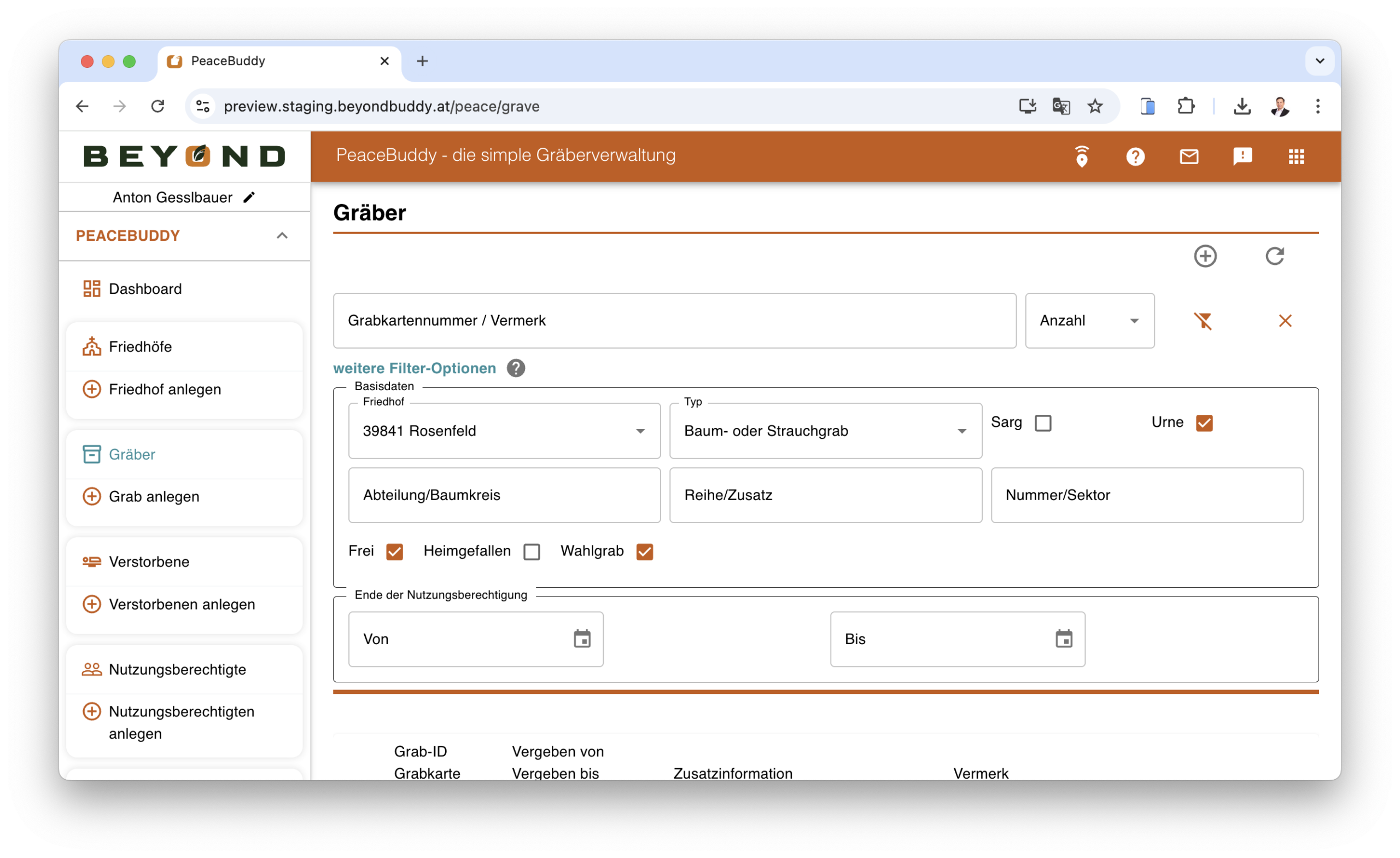 PeaceBuddy unterstützt alle zentralen Verwaltungstätigkeiten einer modernen Grabverwaltung in einem klar strukturierten Ablauf. Verfügbare Gräber können mithilfe transparenter Suchfunktionen und vielfältiger Filter schnell nach den Wünschen der Angehörigen gefunden werden. Anschließend lassen sich Graburkunden und weitere Dokumente direkt erstellen, während automatische Erinnerungen an auslaufende Nutzungsfristen oder notwendige Grabpflege den Verwaltungsaufwand deutlich reduzieren. Alle relevanten Verrechnungsinformationen werden übersichtlich aufbereitet und über definierbare Schnittstellen nahtlos an die Buchhaltung übergeben, sodass der gesamte Prozess effizient, nachvollziehbar und fehlerfrei abläuft.